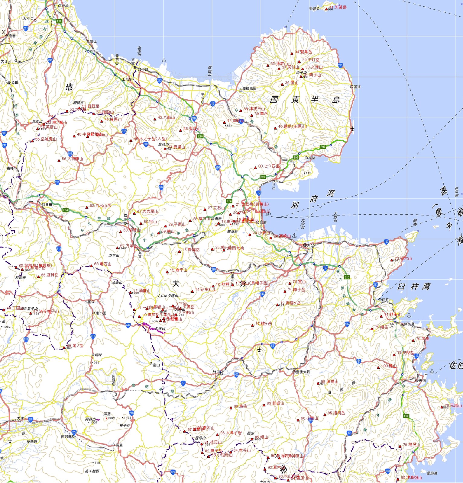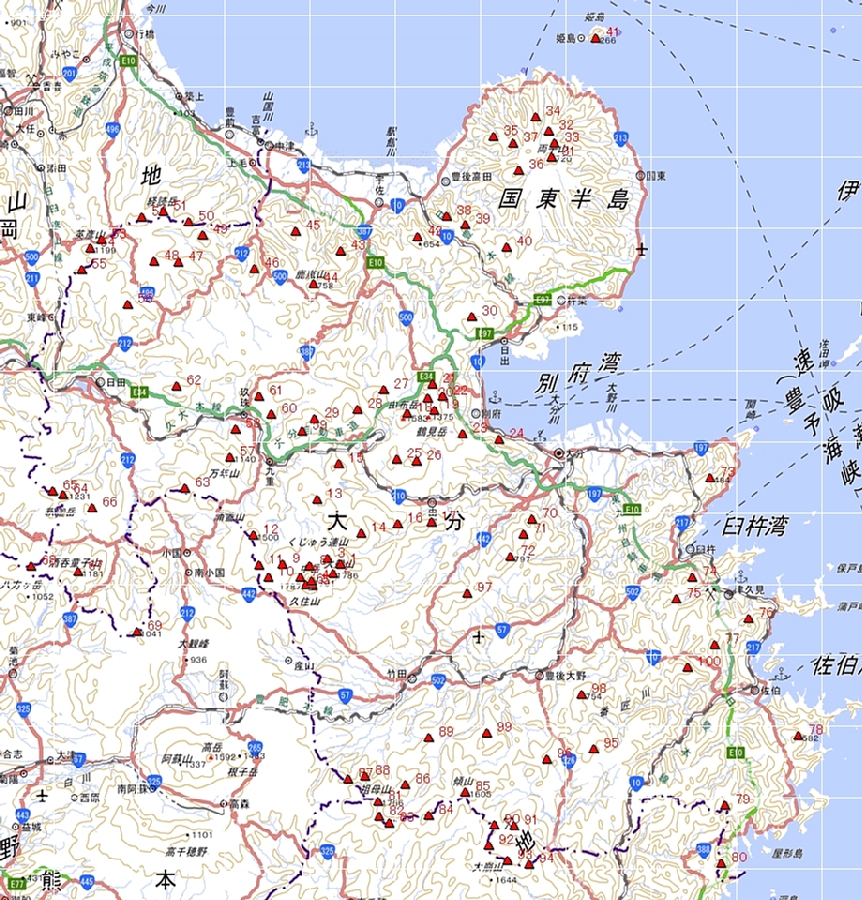 | 1.九重山群とその周辺 | 1~17 | 2.由布・鶴見とその周辺 | 18~30 | 3.国東半島 | 31~41 | 4.宇佐・耶馬渓地方 | 42~56 | |||