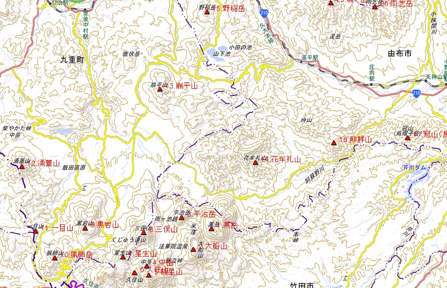 | 3→4 | 平治岳 | ひいじだけ | 1642.8 | ⑦2024_05.30 ⑥2025_05.28 ⑤2024.05.30 ④2023_06.03 ③2022_05.27 ②2021.06.09 ①2020_05.29 |