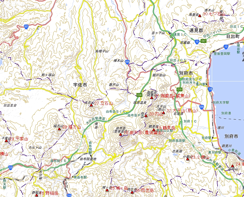 | 20→21 | 内 山 | うちやま | 1275.4 | 2020_05.01 | 塚原温泉入口が登山口。2座共通の登山口。火口見学もでき、温泉にも入れる。 | 湯布院町塚原 | |