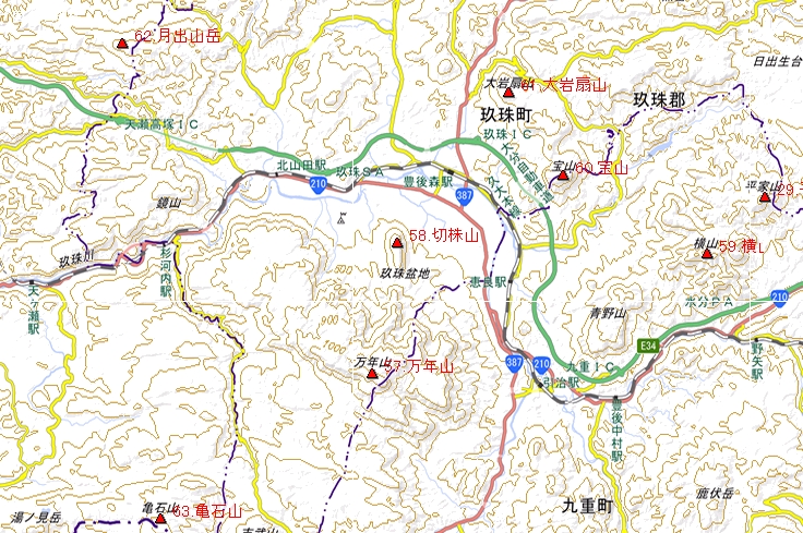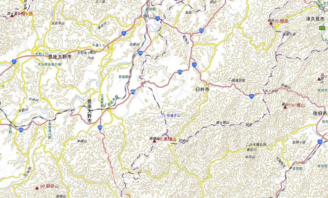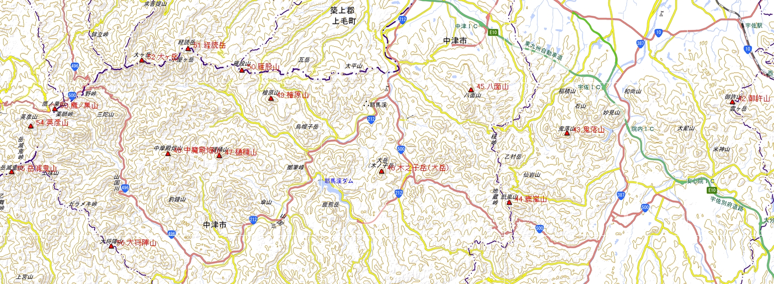 | 9.祖母・傾山群と宇目 | 81~96 | 10.大野直入 | 97~100 | 11.全体地図(山名入) | 1~100 | 12.全体地図(Noのみ) | 1-100 |